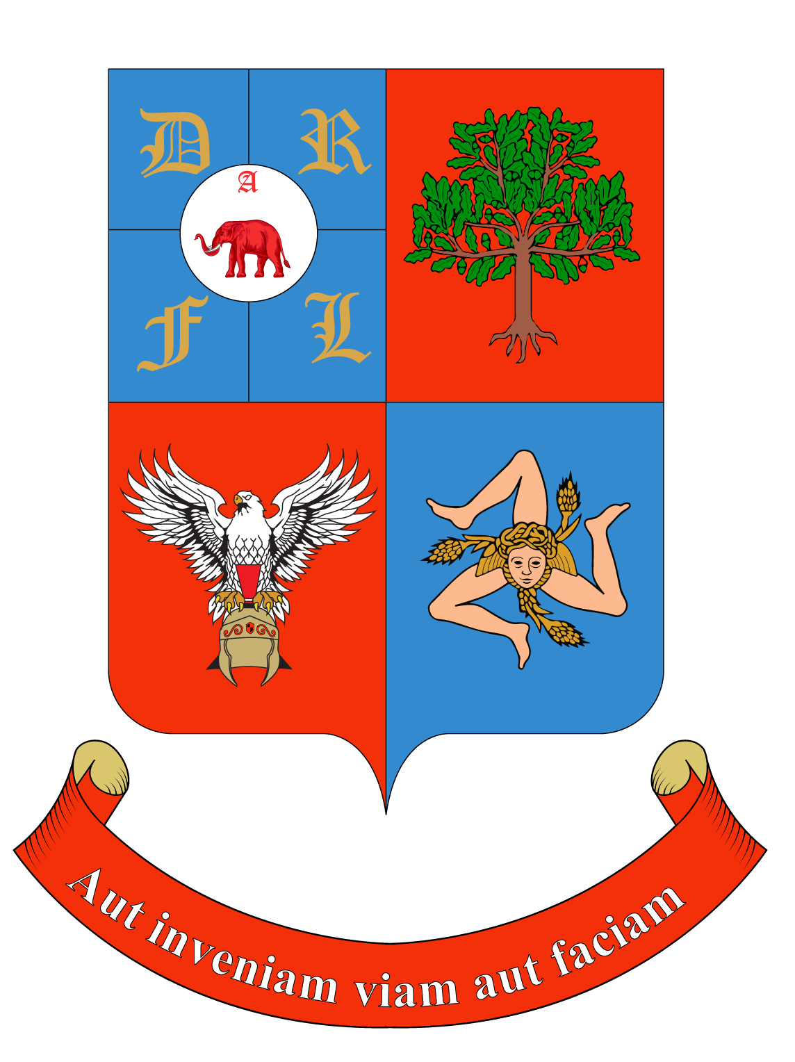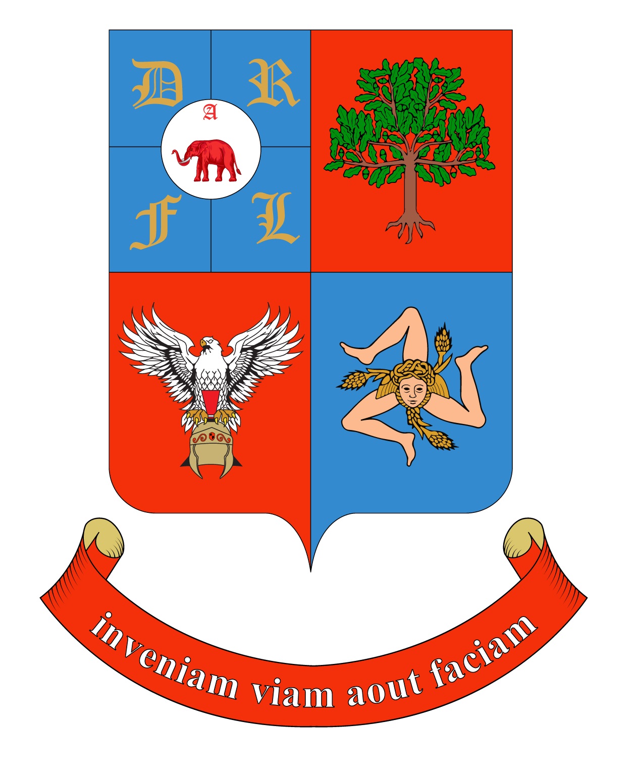 Arma: inquartato: nel 1° d'azzurro, alle lettere gotiche DRFL d'oro, divise da un filetto in croce, sul tutto un bisante d'argento caricato da un elefante di rosso, sormontato da una lettera gotica A dello stesso; nel 2° di rosso, alla quercia al naturale; nel 3° di rosso, all'aquila dal volo spiegato d'argento, reggente un elmo greco d'oro; nel 4° d'azzurro, alla triscele di carnagione, con il gorgoneion e le spighe al naturale