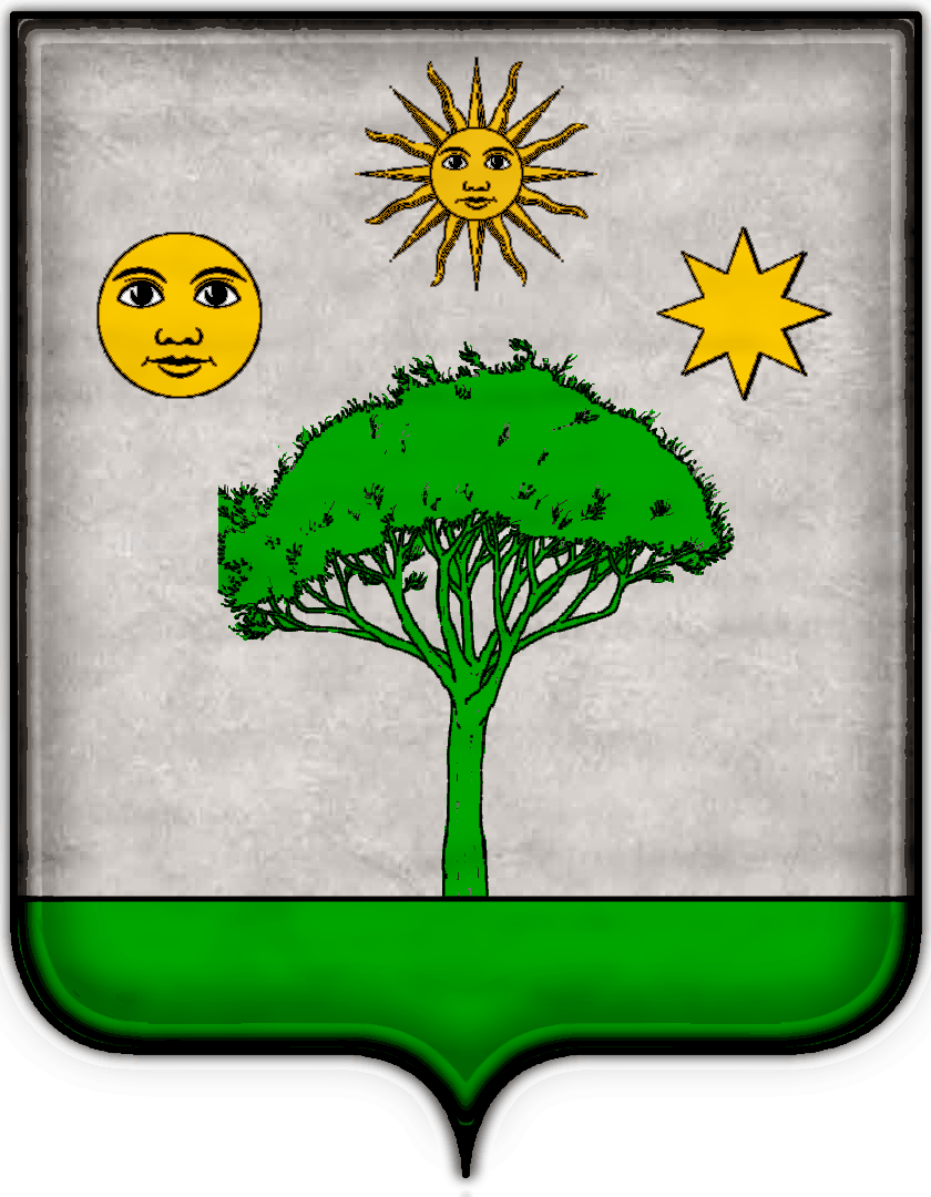 Arma: d'argento al pino marittimo di verde movente da un terrazzo dello stesso e accompagnato in capo da un sole raggiante (16), accostato a destra da una luna e a sinistra da una stella (8), il tutto d'oro.
