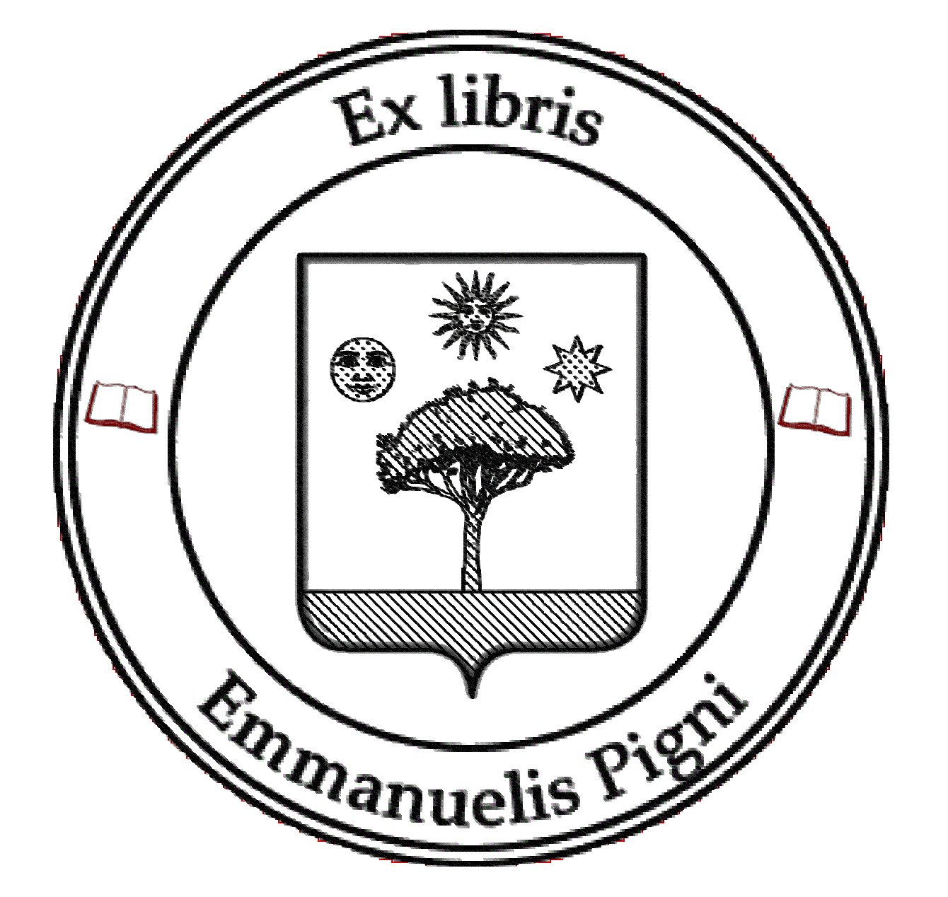 Ex libris: uno scudo rotondo con al centro lo stemma Pigni circondato dalla legenda <<Ex libris Emmanuelis Pigni>>.