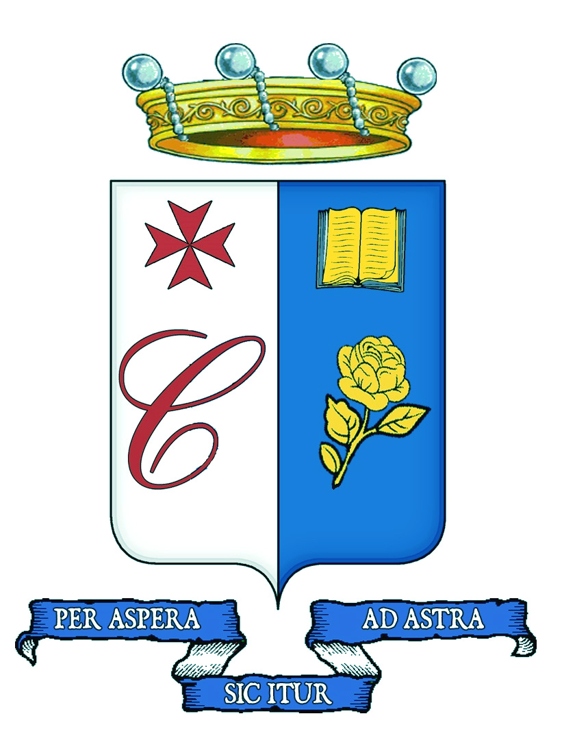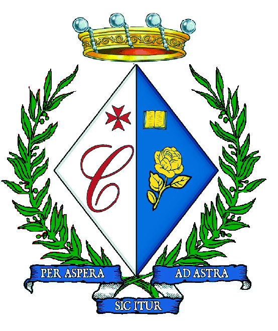 Arma: partito; nel 1° d'argento, alla lettera C di rosso, sormontata da una croce biforcata del secondo; nel 2° d'azzurro, alla rosa d'oro, sormontata da un manoscritto aperto del secondo.